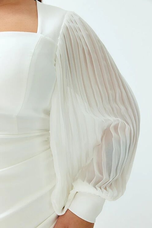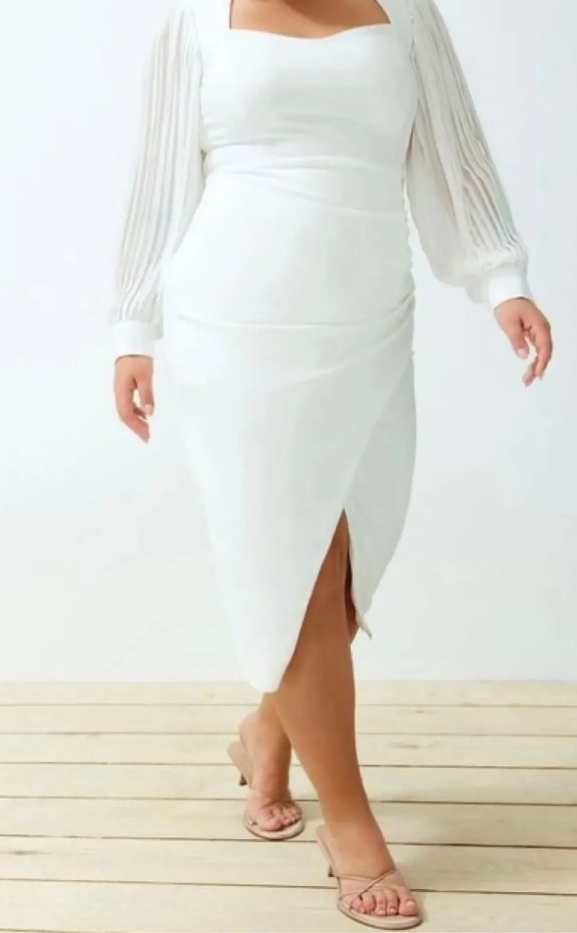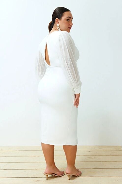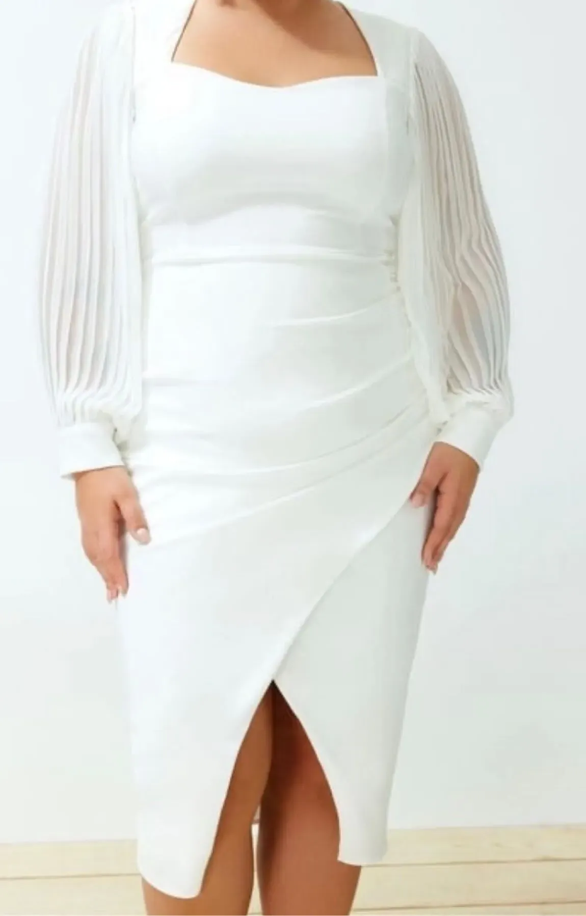 Beyaz Uzun Kol Yırtmaçlı Dokuma Büyük Beden Bridal/Şık/Gece/Nikah Elbise