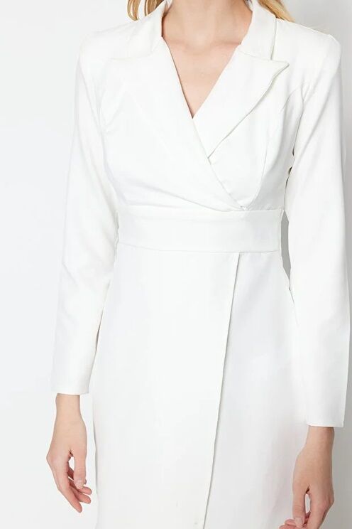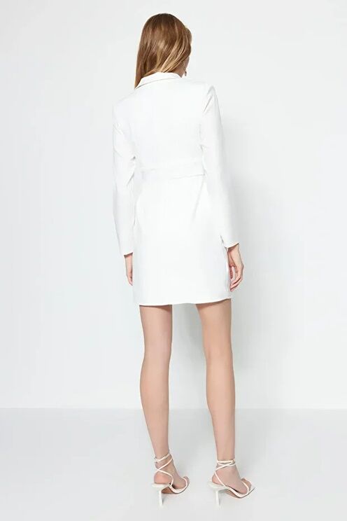 Uzun kollu ve ceket yaka tasarımı ile şıklığı ve rahatlığı bir arada sunan ekru kruvaze mini dokuma elbise, her ortamda dikkat çekici bir görünüm sağlar.
