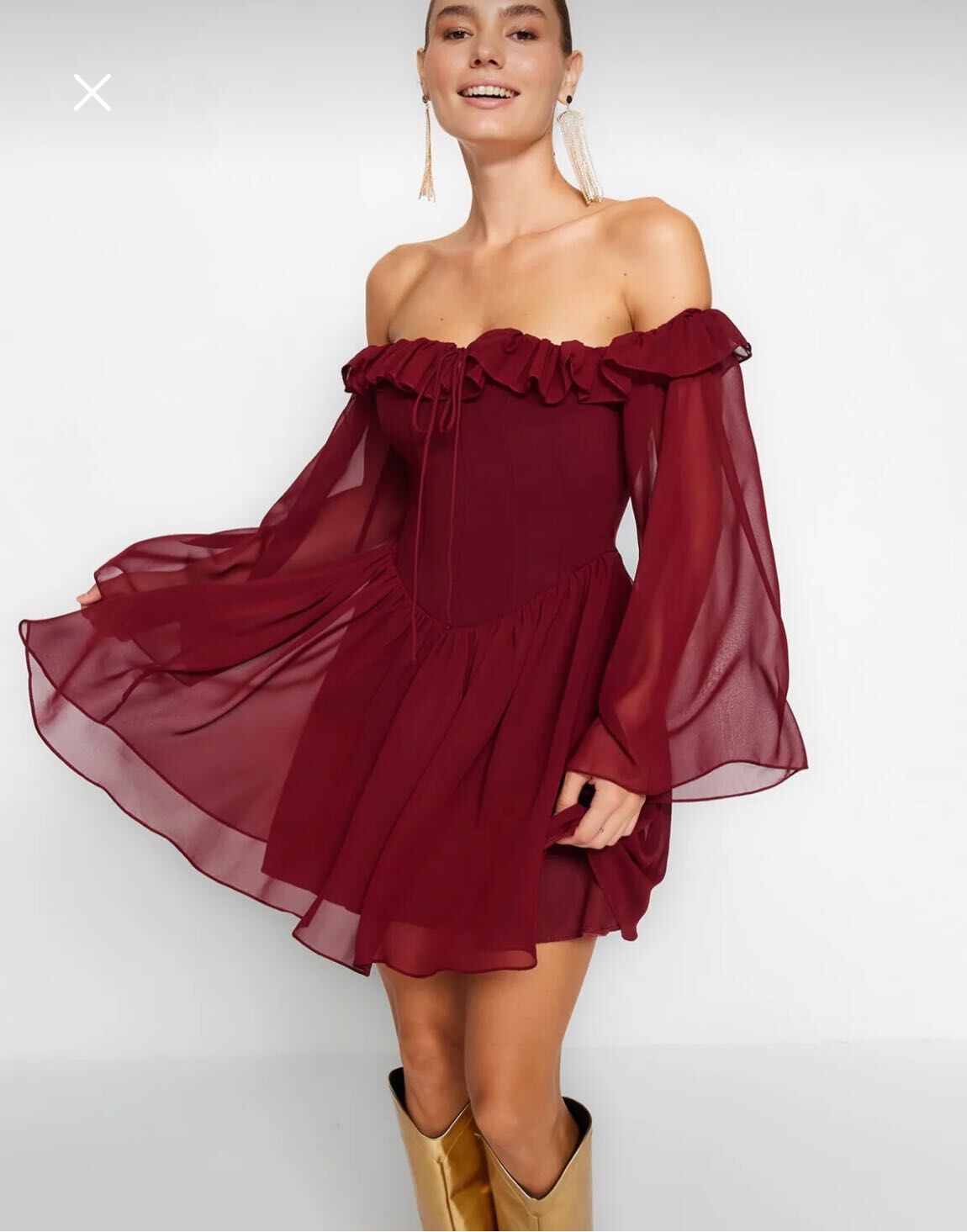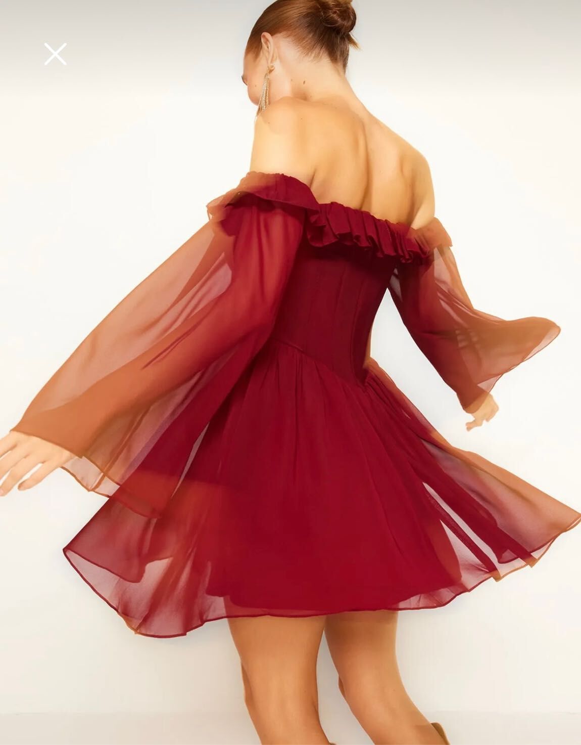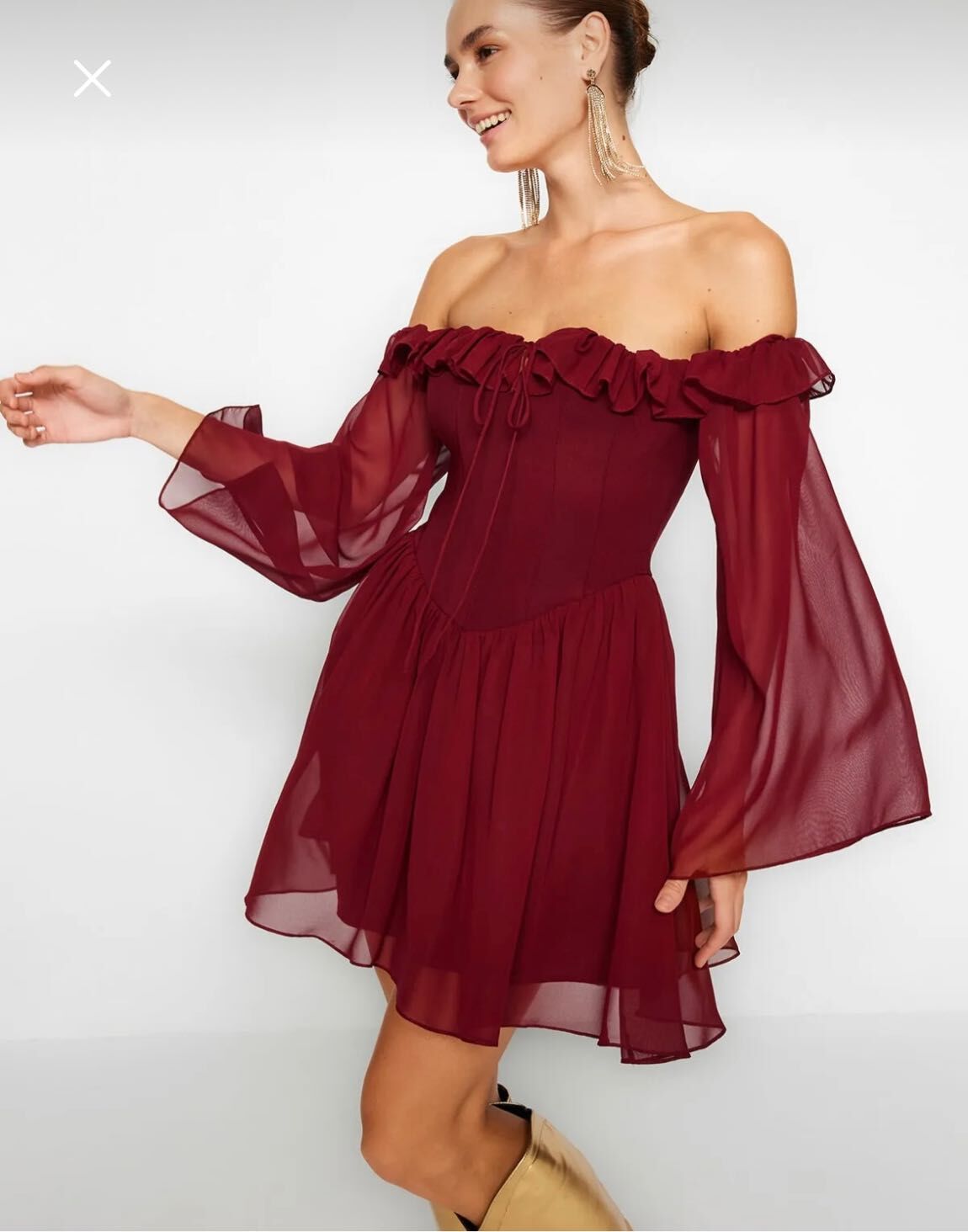 Mezuniyet Balo Şifon Dokuma Carmen Yaka Uzun Kol Skater Mini Elbise