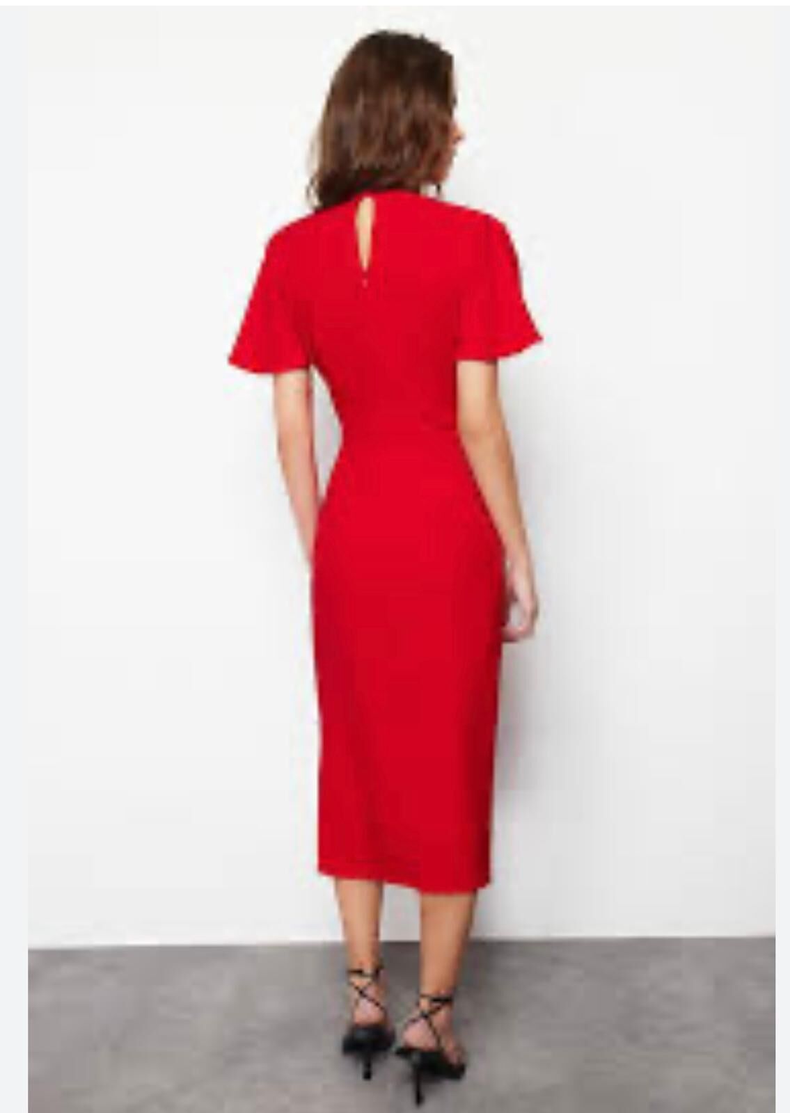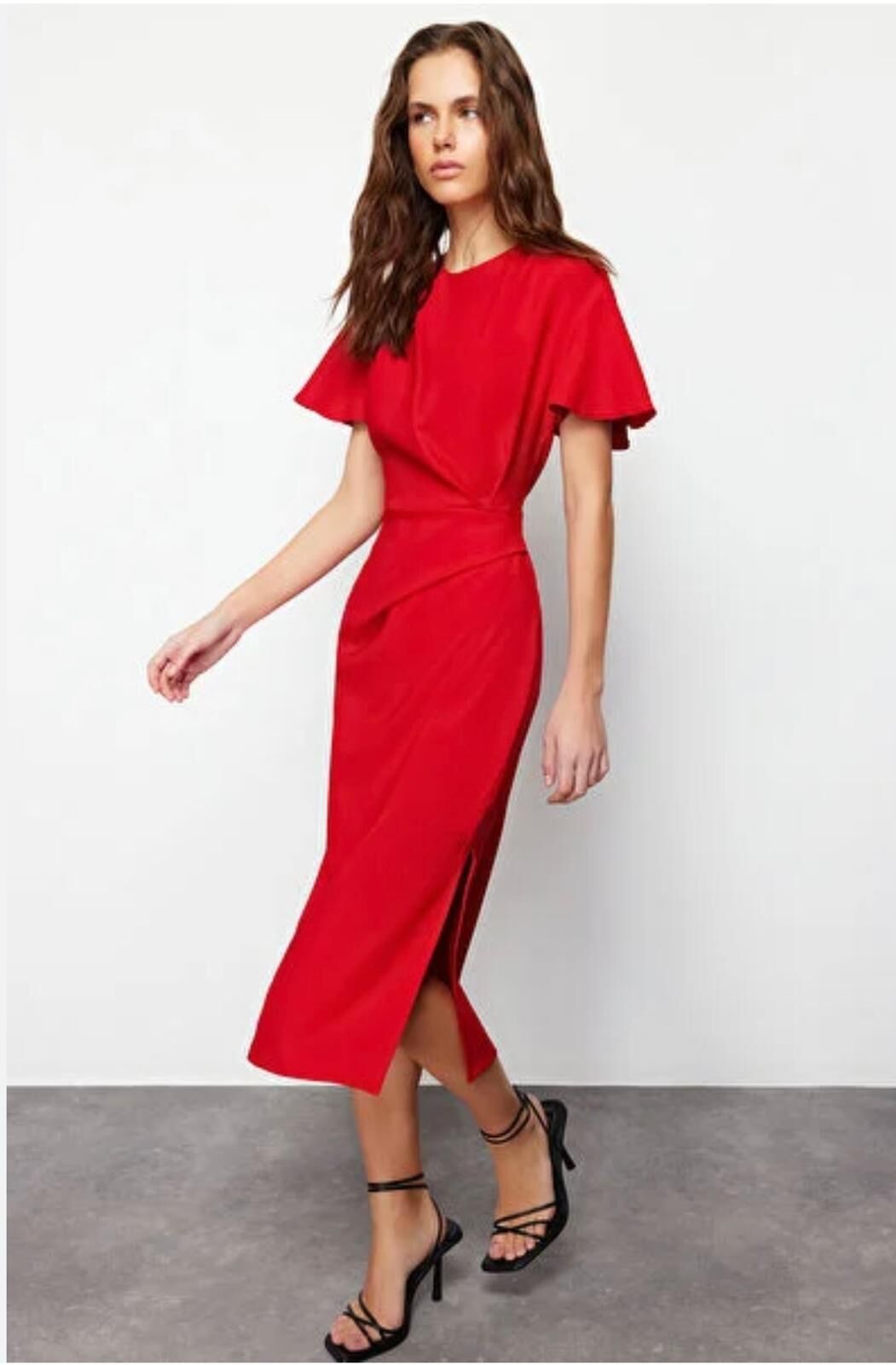 BÜZGÜLÜ KIRMIZI MİDİ DOKUMA ELBİSE (44 BEDEN)