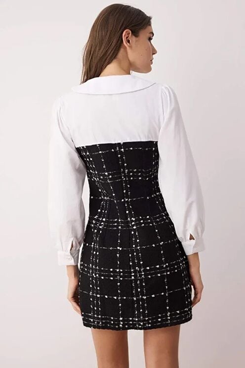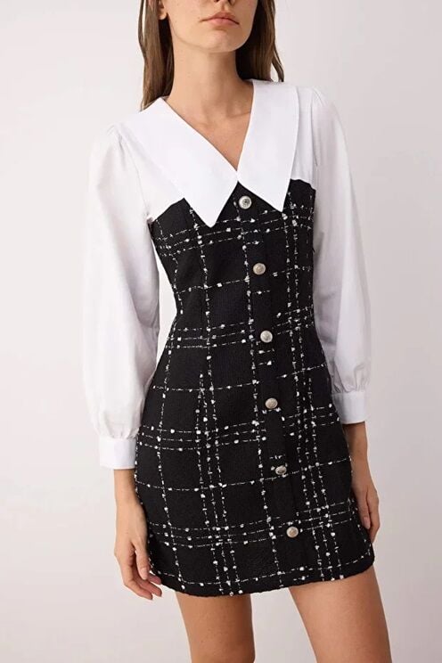 Siyah A Kesim Gömlek Yaka Tüvit Mini Dokuma Elbise