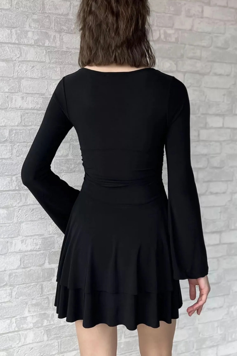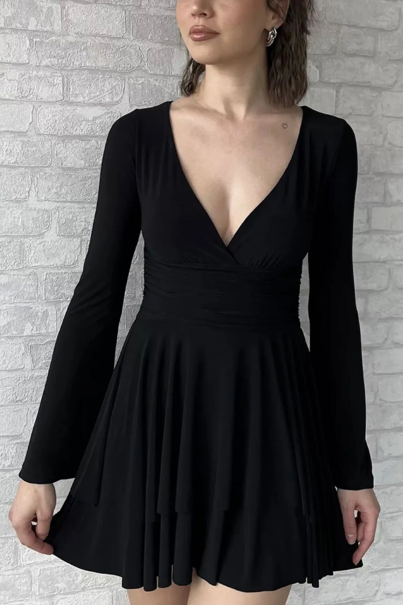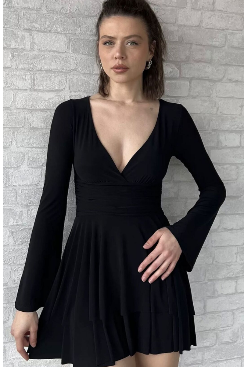 Siyah Kadın V Yaka İspanyol Kol Kat Kat Pileli Likralı Elbise